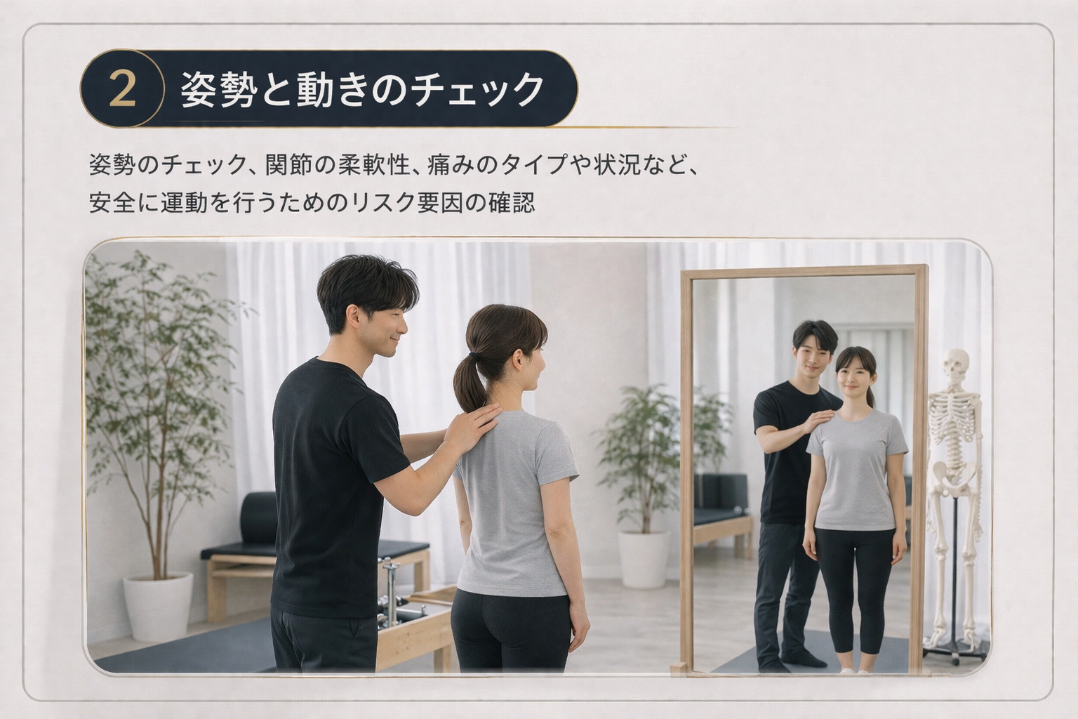 お客様の目的達成にとって最適な『姿勢改善』をより安心安全な状態で実施するため、担当トレーナーがお客様のお身体の状態を把握すると同時に、お客様へ分かりやすく解説させていただきます。