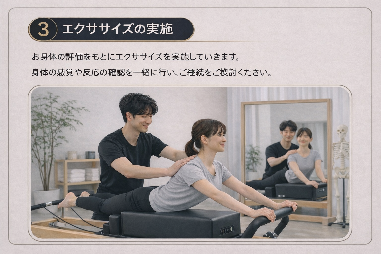 ピラティスはリハビリテーションを起源としているため、これまで運動経験のあまりないお客様も安心して継続できる運動習慣を身につけていただけます。