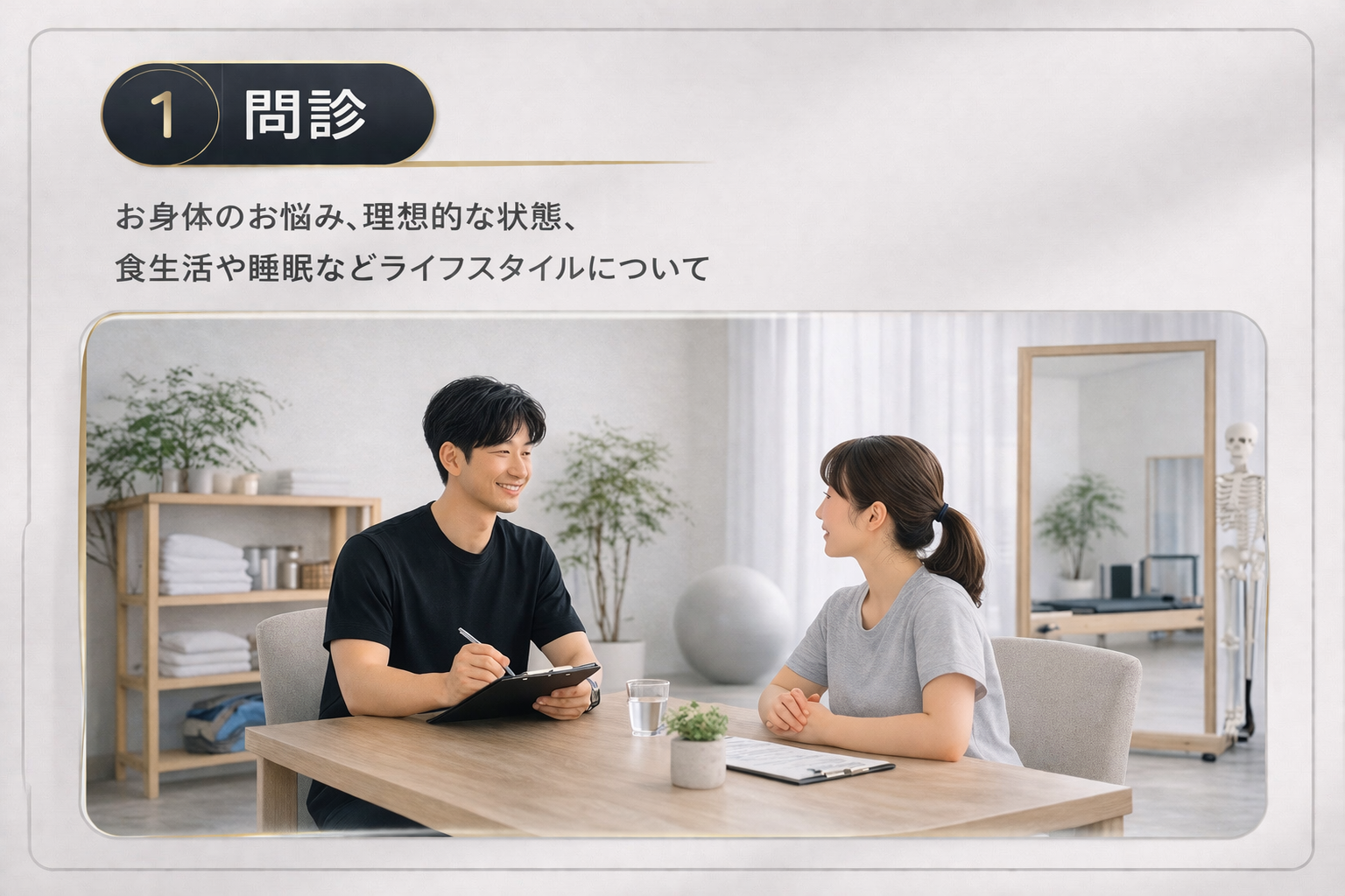 お客様の目的達成のための効果的な運動を提供するため、お客様のお身体やその背景のことを知るため問診のお時間を頂戴しております。