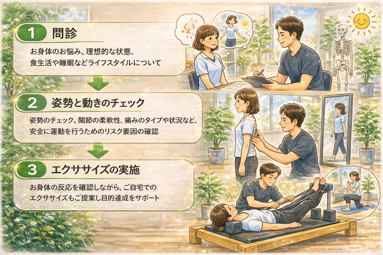 ホコルルの初回レッスンではお身体の状態を『問診(ライフスタイル、食事、睡眠について)』、『姿勢・動きのチェック』、『エクササイズの実施』の段階に分けてお客様にとっての最善な姿勢改善をご提案させていただきます。