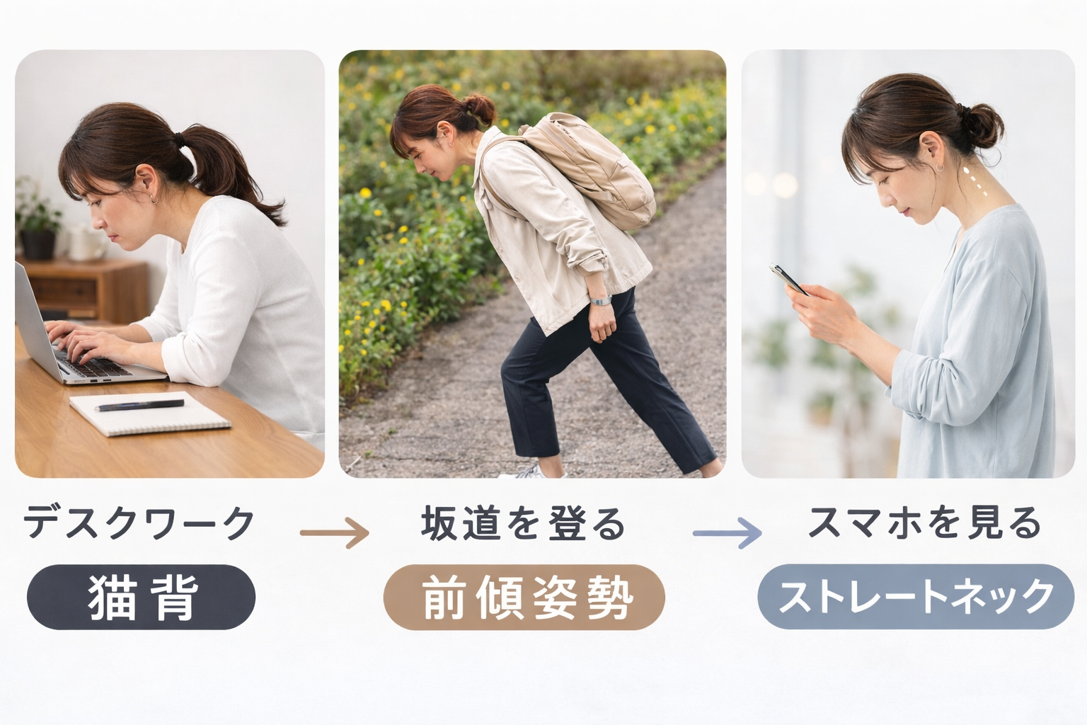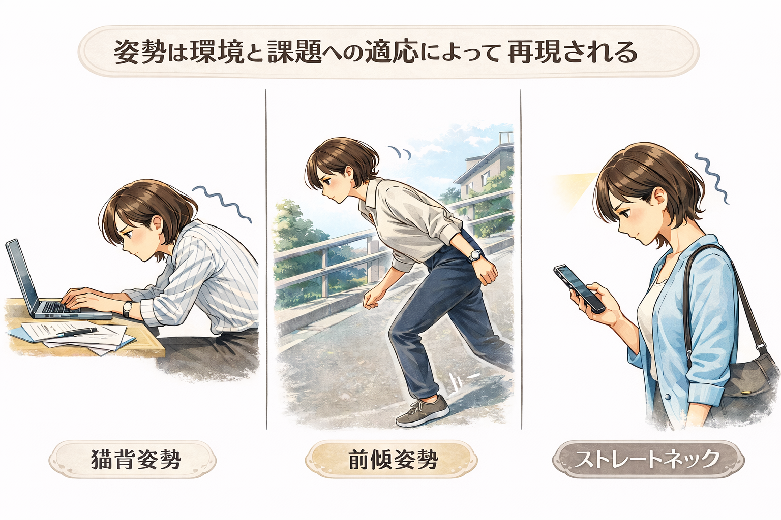 そして、猫背や前傾姿勢、ストレートネックなどの姿勢になることは環境と課題への適応であり決して悪いわけではなく、本当の問題はこのような姿勢が長期化することなのです。