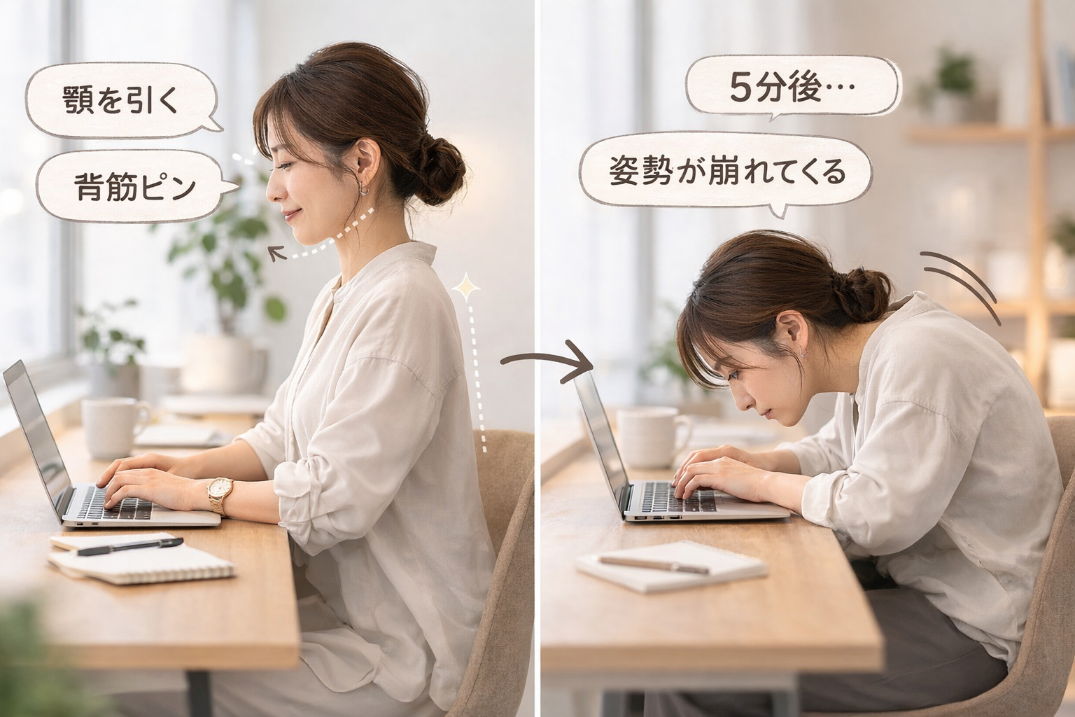 例えば顎を引いたてみたり背筋を伸ばすような意識を向けていたとしても、気がつくと姿勢が崩れてしまっている。