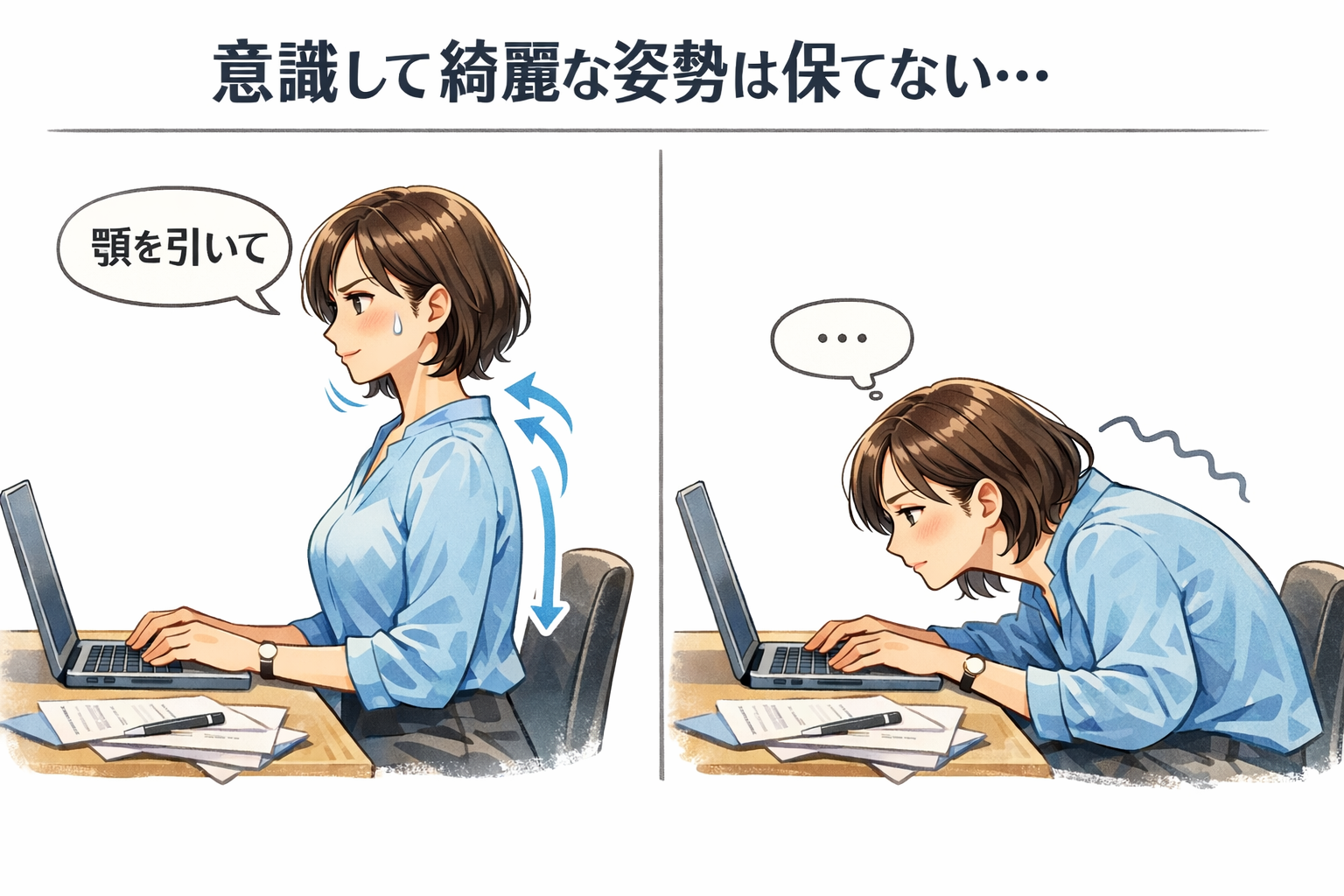例えば、顎を引いたり背筋を伸ばすように綺麗な姿勢を保とうと意識を向けていても、気がつくと姿勢が崩れてしまっている。