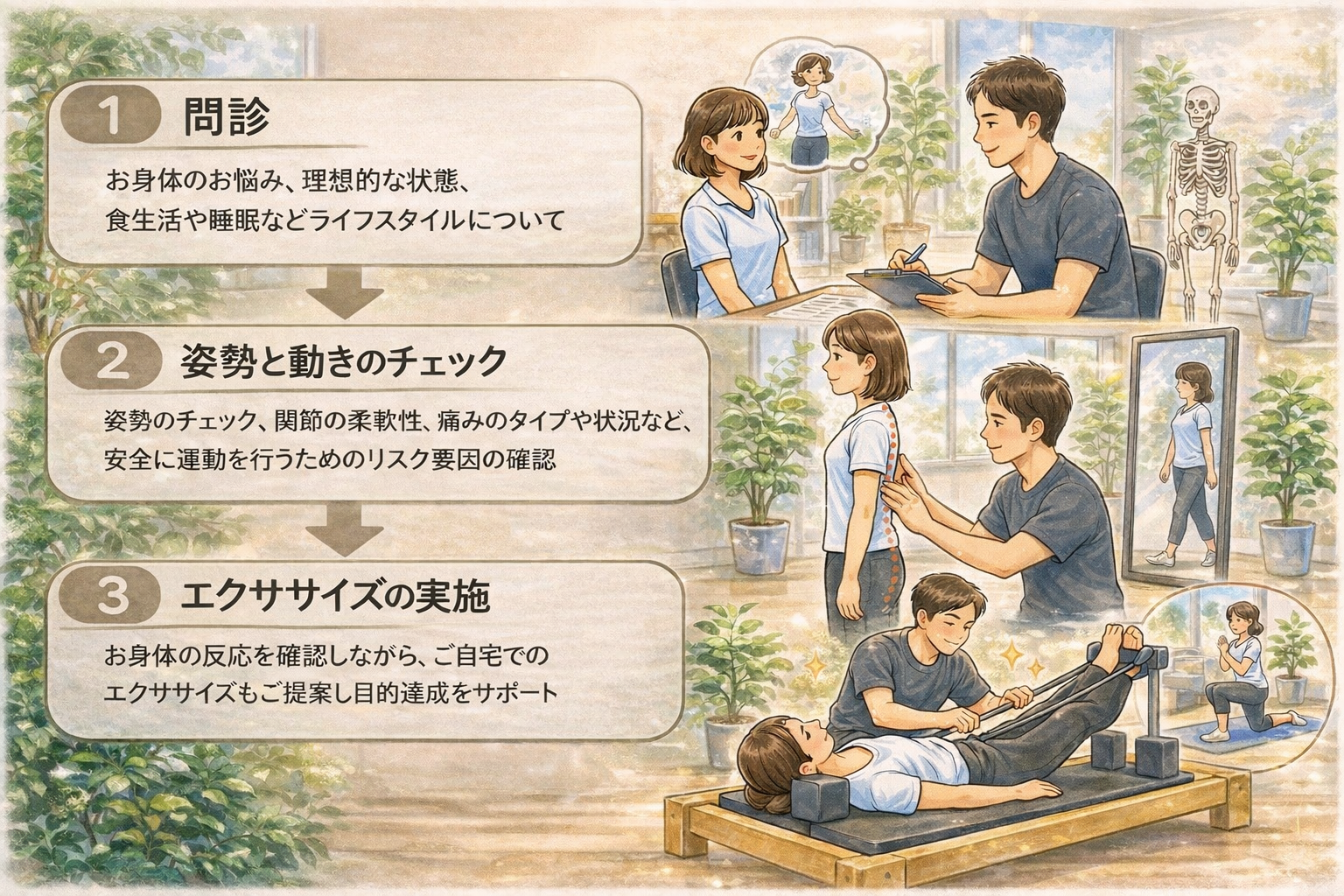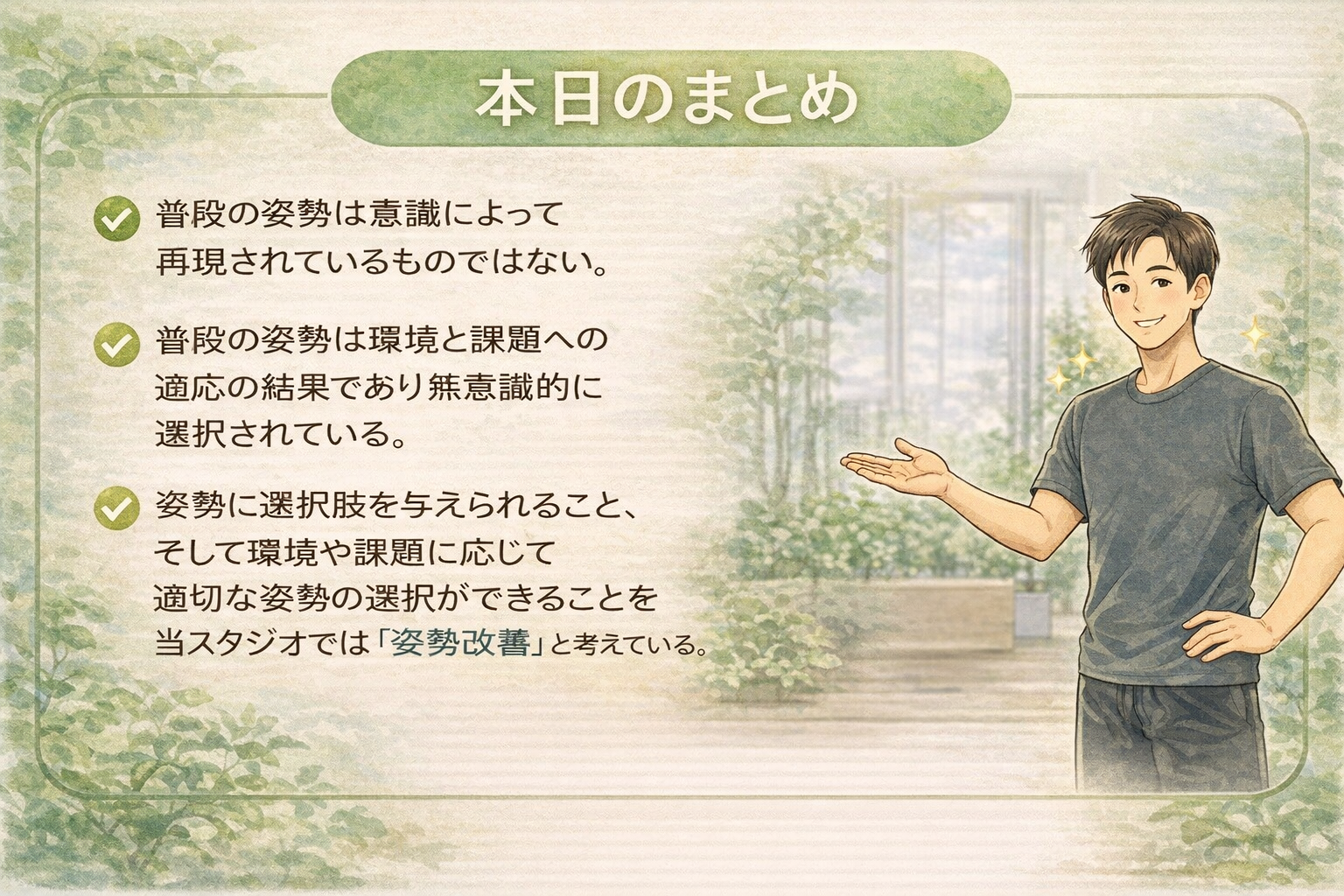 現在抱えているお身体のお悩みを、姿勢から紐解き改善を目指していくことにご興味のある方は、ぜひ一度お気軽に当スタジオまでお問い合わせください。