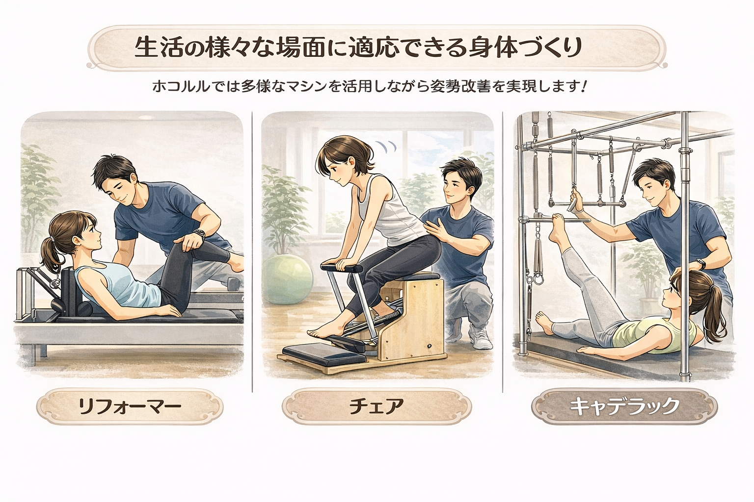 ホコルルではこの姿勢の選択肢を増やしていくこと、そして環境や課題に応じて適切な選択ができるようになる状態を目指すことを『姿勢改善』と考えて、ピラティスを提供しています。