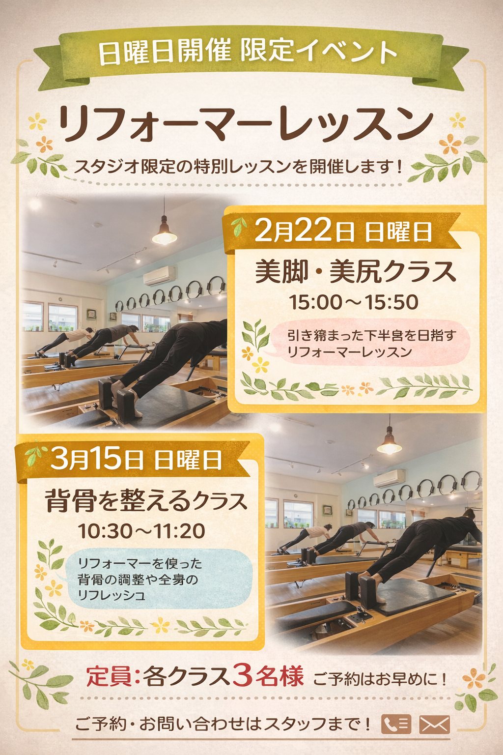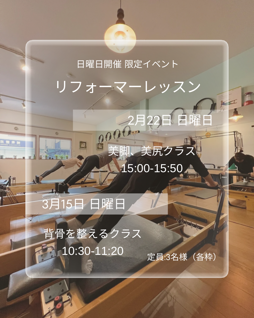 『日曜日限定イベント』リフォーマーレッスンのお知らせ。